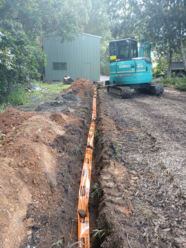 Running underground sub-mains involves the installation of mechanically protected cabling through conduit, which must be trenched at the correct depth and backfilled appropriately. On rural properties, this often necessitates collaboration with an earthworks contractor for the trenching process. The electrical connections at both ends, including those at the main switchboard and the shed sub-board, must be executed by licensed electrical professionals. We manage the entire process, overseeing earthworks, so you only need to communicate with one point of contact instead of juggling multiple trades, making the project more streamlined and efficient for your convenience.